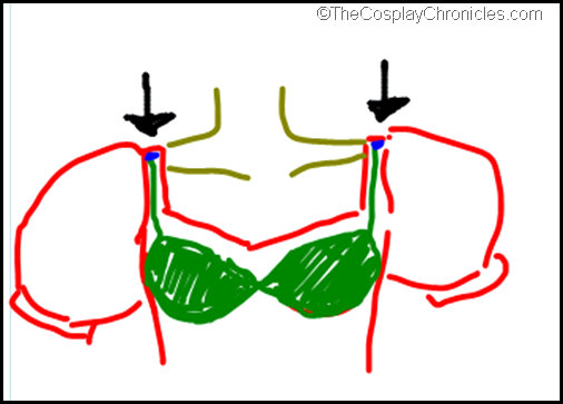 I used 2 safety pins (or rather, I got helpful noshuu to help me pin them on the day itself because I was too lazy to prepare before hand *gets bashed x3* ) and pined them at the blue dots indicated in the picture below. Then I got my bra strap to run through the pins, kinda like a loop for a belt. I must say this method worked beautifully ;D