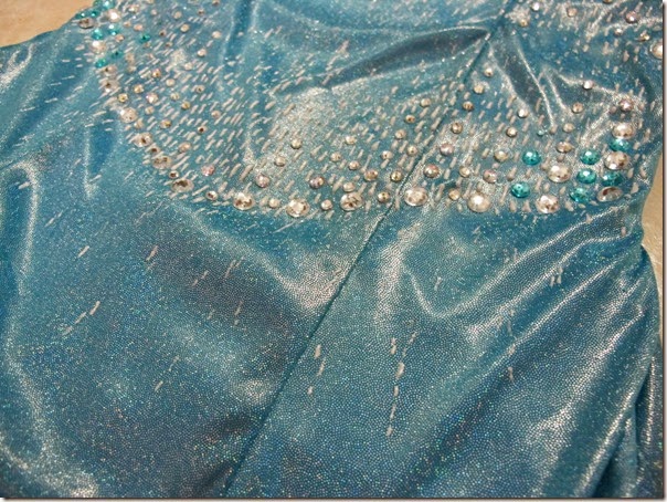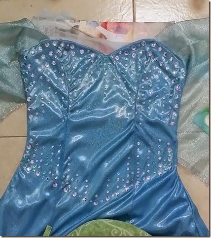 Here’s a photo of the gown with just the gems of differing sizes stuck on. Since I already had the glitter liner, I used it to draw small dash strokes around the gemstones to help ease the contrast of the gems and the fabric.