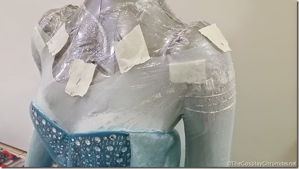 In the pictures, Elsa's sheer white collar just seems to lay precariously near the edge of her shoulders. And while it was a stunning design, I foresee major wardrobe malfunction issues. Such a wide shoulder collar cannot hold the weight of the entire dress and cape. So instead of letting the shoulders be the stress points of the gown, I designed for a corset to take the stress instead.