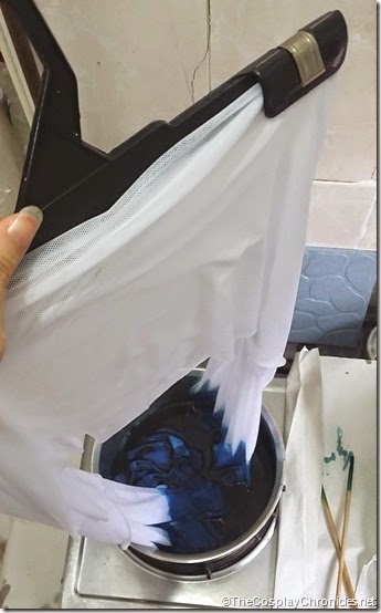 I basically held the pants hanger as levelled as I could to ensure both ends are equal, then dipped the ends into the dye, jiggled it a little to make sure the colours penetrate the fabric, brought it up and quickly dip it into the cold water. The dye works better if the water is very hot.