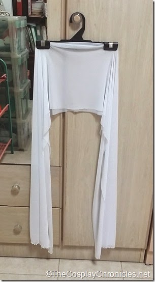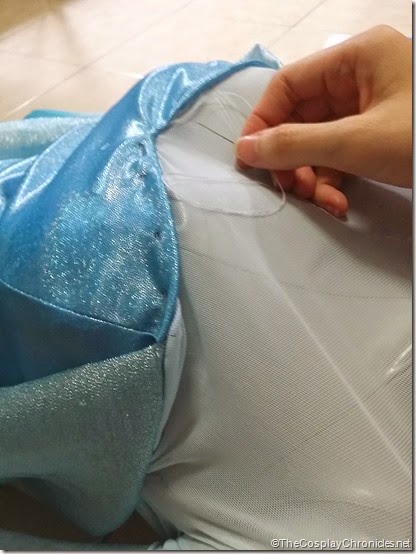 I hand sewed the delicate netting top to the gown. However this method proved really difficult as the netting was stretchy and it was really difficult to make sure there is just the right length of fabric on my shoulders. I think I re-sewed it for maybe 5 times -__-;;; Anyway, I had a very hard time trying to get the white sleeved top to fit as well as I had hoped. I think my design was wrong from the beginning and probably should have made it like a regular long sleeved top with individual sleeves instead of this 2d top design.