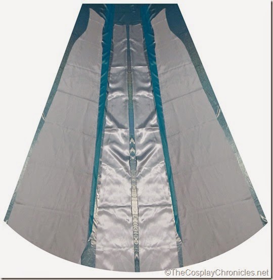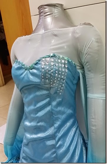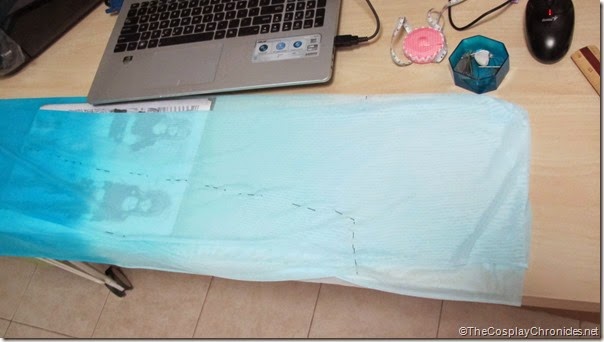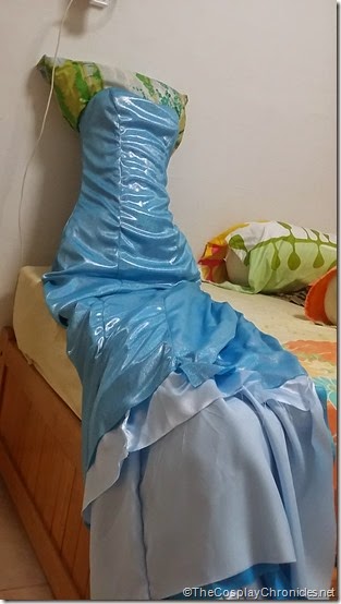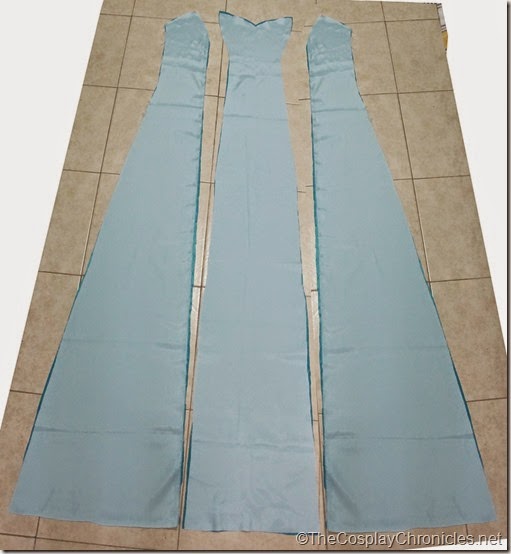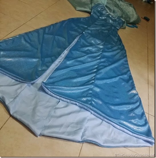 Because Elsa has a side slit in her gown, I decided to make lining for it. Also because the material I bought for her dress was a stretchy metallic pvc that I fear might tear on me. Of course I've performed adequate stress tests with the fabric before buying (such as pulling in all directions xD) but since the fabric will be covering majority of my body I'm not taking any chances. So just to be safe, I made lining with light blue satin.