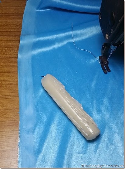 The blue metallic pvc I bought was very pretty but awfully difficult to work with. It was too slippery even for my industrial sewing machine and I couldn't stitch it at all! Thankfully my mom taught me the trick of rubbing candle wax along the stitch to give the machine something to cling on!