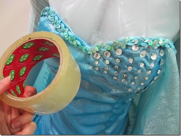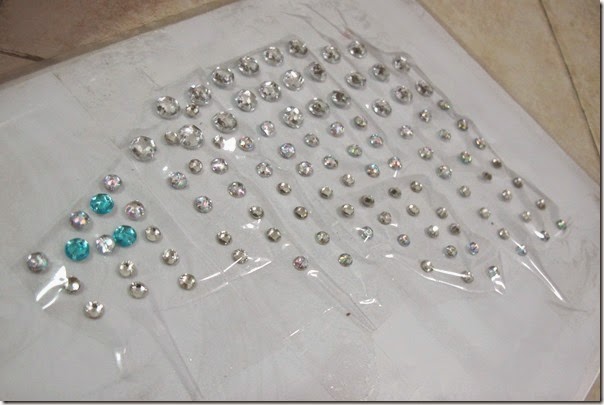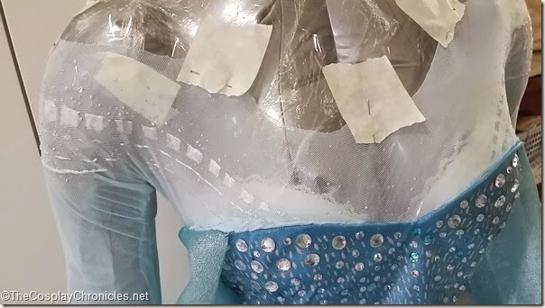 I laid my gown flat and arranged the gems until i was satisfied with where I was going. I then stuck a layer of clear scotch tape over the gems and gown to keep them in place. Then i slipped the gown onto my mannequin for a visual check.