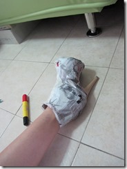 To figure out how to make the ‘socks’, I first start by test and trialing with a pair of old sock. Using a covered pair of shoes would be much preferred .